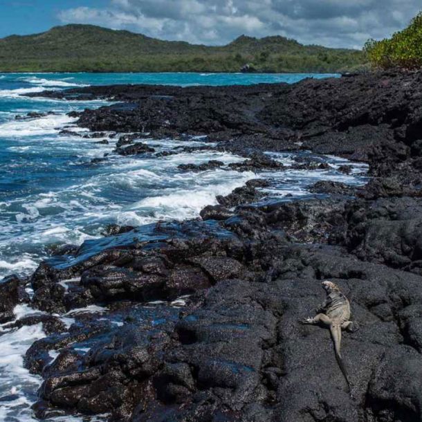 Explore dramatic cliffs, vibrant red Sesuvium vegetation, and unique hybrid iguanas.